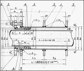 1、本图尺寸均以毫米来计。 2、柔性防水套管一般穿过墙壁之处受有振动或有严密防水要求的构筑物。 3、套管部分加工完成后,在其外壁均刷底漆一遍(底漆包括樟丹或冷底子油)。外层防腐由设计决定。 4、套管穿墙之墙壁,如遇非混凝土墙壁时应改用混凝土墙壁,其浇注混凝土范围应比翼环直径(D6)大200mm,而且需将套管浇固与墙内。 5、穿管处之混凝土墙厚应不小于300mm否则应使墙壁一边加厚或两边加厚。加厚部分的直径较小应比翼环直径(D6)200mm。 6、套管的材料重量是按墙厚L值为300mm应另行计算。 7、套管部件焊接材料,用A3材料制作,T42焊接。 |